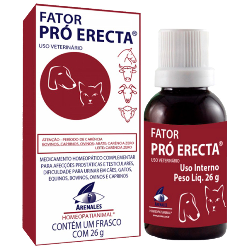 Fator Pró Erecta é indicado como medicamento homeopático complementar para hipertrofia prostática, urina com dificuldade gota a gota, testículos aumentados e duros em cães, gatos, equinos, bovinos, ovinos e caprinos.