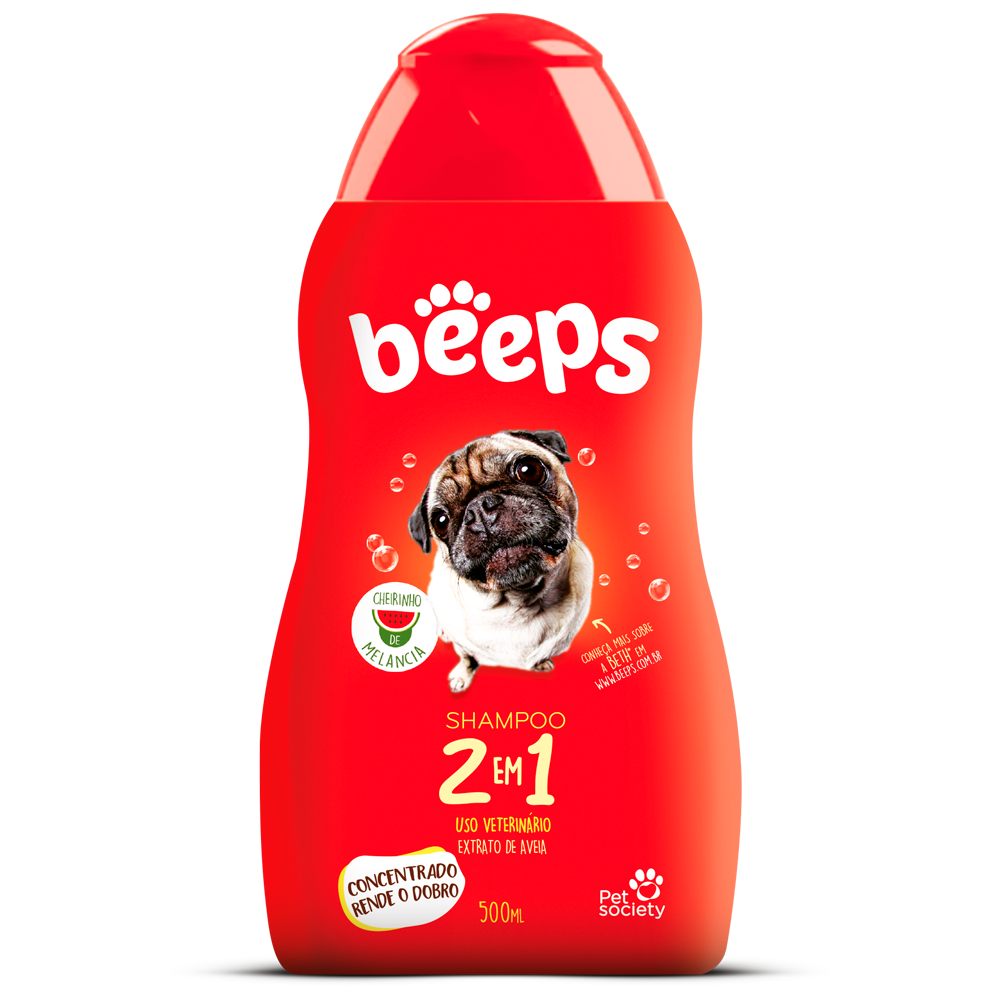 MODO DE USAR: Uso tópico, dilua uma parte do Shampoo Pet Society Beeps 2 em 1 em uma parte de água. Aplique o produto sobre a pelagem molhada, massageie suavemente seu corpo até formar uma espuma uniforme, enxague bem e, se necessário repita a operação.
