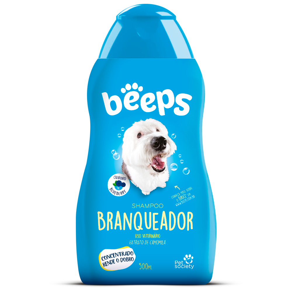 A linha Beeps é segura, prática e vai transformar o banho em um momento único, especial e muito divertido. O Shampoo Pet Society Beeps Branqueador é prático e vai deixar o banho do seu pet muito mais gostoso, além de ficar com os pelos macios e bem limpinhos. Com cheirinho de blueberry, extrato de camomila e branqueador óptico realça a cor de pelagens brancas e intensifica o brilho das pelagens de outras cores
